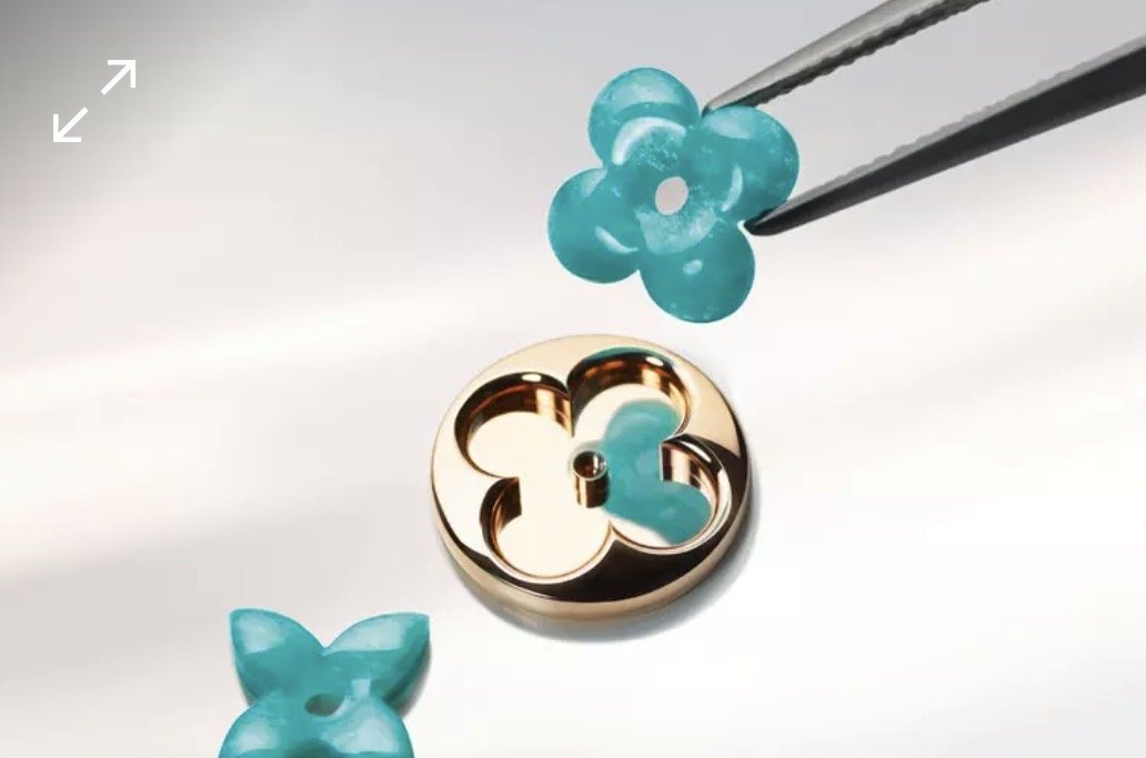 After careful selection, the raw stone is cut and inspected again before shaping begins. It is at this stage that the Monogram flowers come to life in three dimensions — a complex cutting and polishing process requiring exceptional craftsmanship to achieve perfect symmetry and light reflection, tailored to the unique properties of each hard stone.